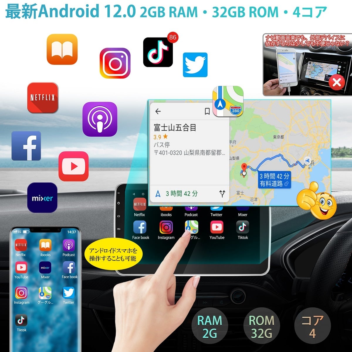 Android12 車載用 カーナビ 1DIN PC 10.1インチ 2+32GB カーオーディオ